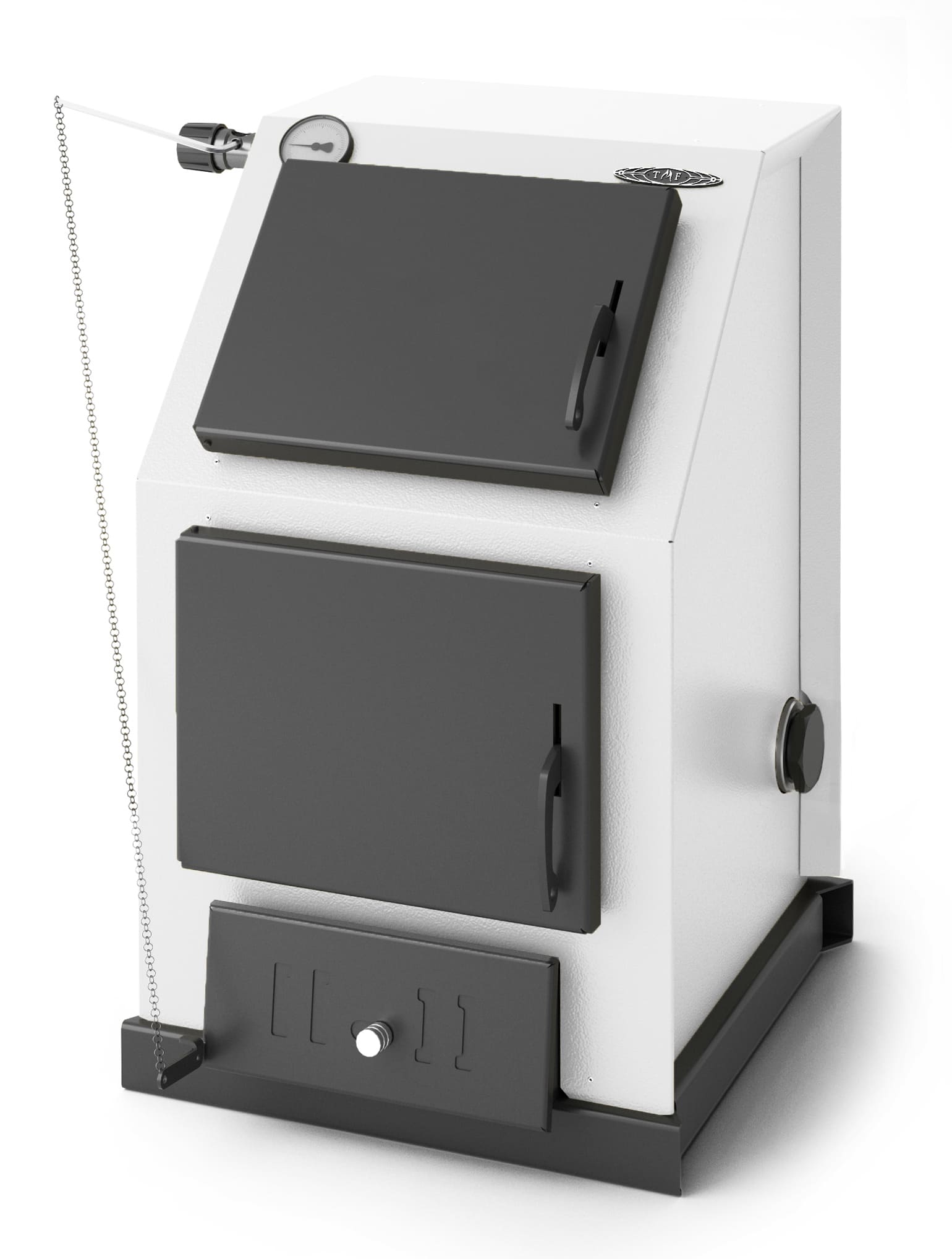 Для лёгкой загрузки угля предусмотрен широкий наклонный прямоугольный люк с удобной дверцей. Нижний люк стал прямоугольным и расположился ближе к полу для удобства загрузки дров и очистки колосника. Для минимизации теплопотерь дверцы обоих люков по всей площади теплоизолированы огнеупорным материалом и плотно прилегают к корпусу. Кроме того, благодаря этому ручки дверок не нагреваются выше безопасной температуры. Для безопасной и удобной эксплуатации котел оснащен встроенным термометром, который определяет температуру теплоносителя.