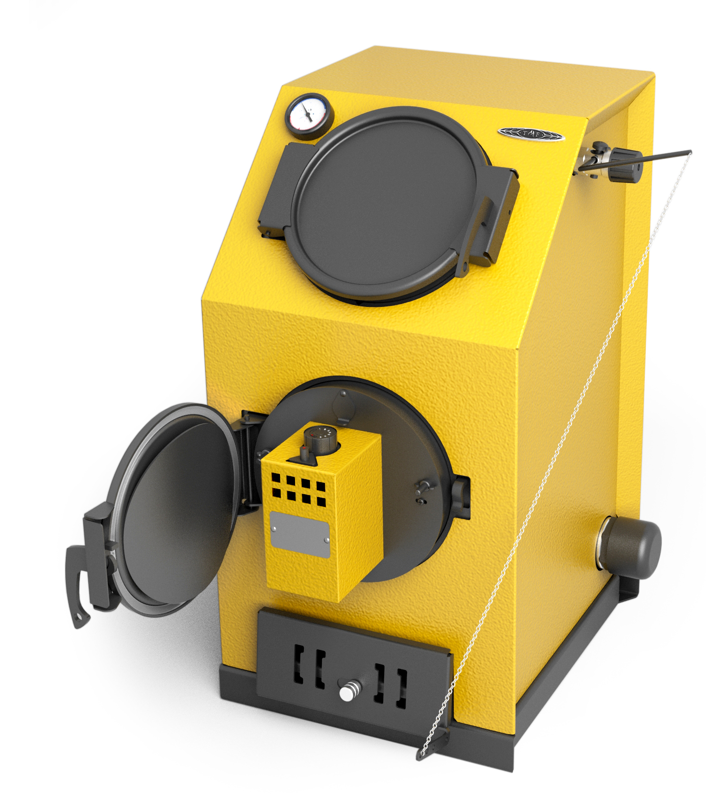 Котел сделан на базе известного твердотопливного котла «Прагматик». Новинка имеет такие же габариты и технические характеристики. Обращаем ваше внимание на то, что каждый водогрейный котел TMF, прежде чем отправиться в магазины, проходит гидравлическое испытание на герметичность и прочность сварных швов, что обеспечивает его гарантированную работу под давлением без протечек. Для удобства эксплуатации предусмотрено два люка загрузки твердого топлива - внизу и сверху. Цвет выпускаемой модели котла - «жёлтый».