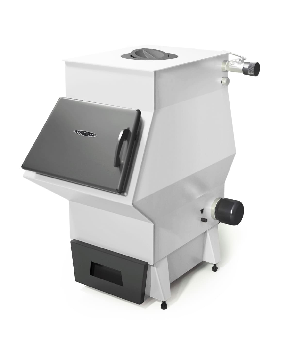 • Большая наклонная дверца удобна для засыпки угля из ведра