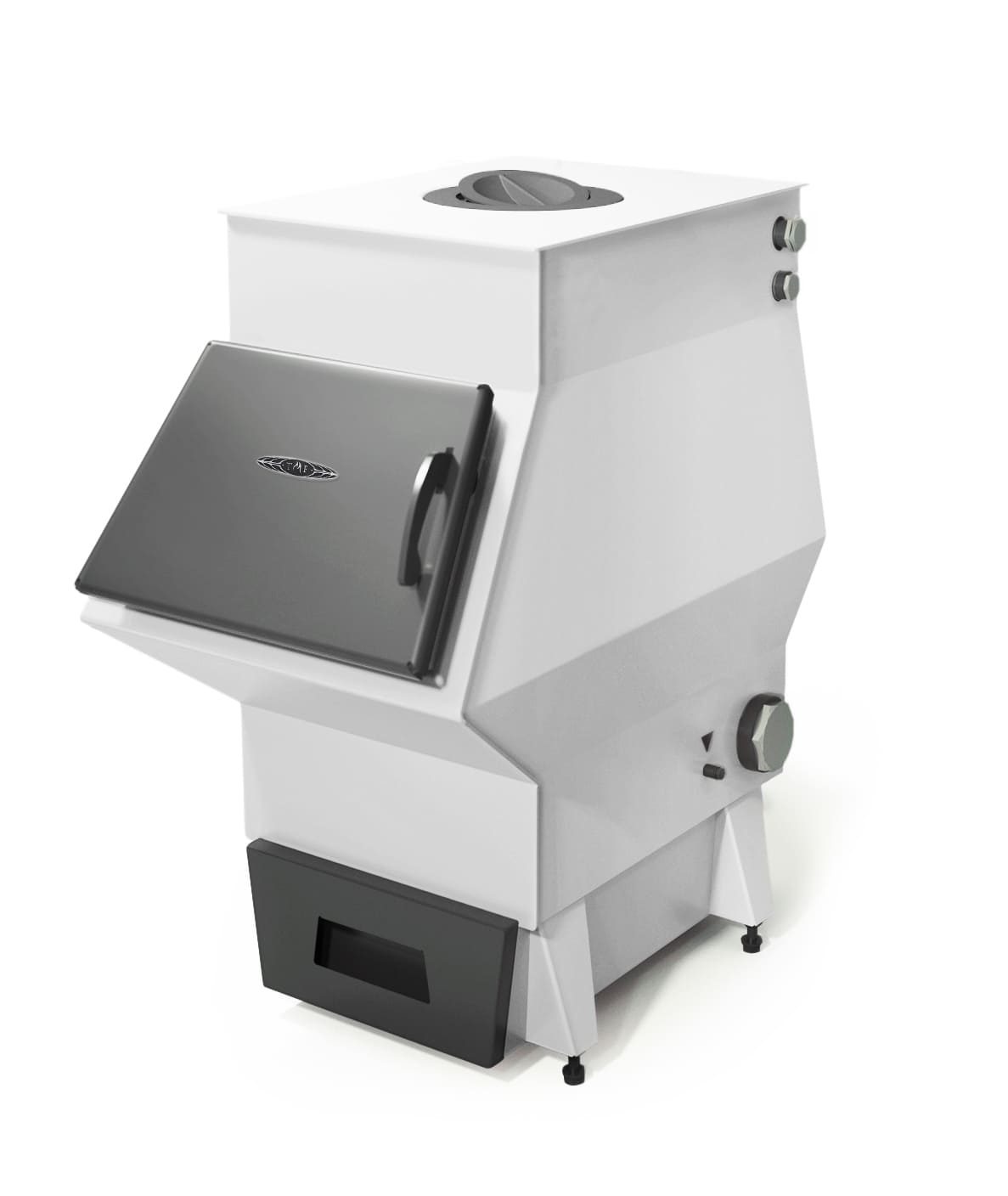 • Большая наклонная дверца удобна для засыпки угля из ведра
