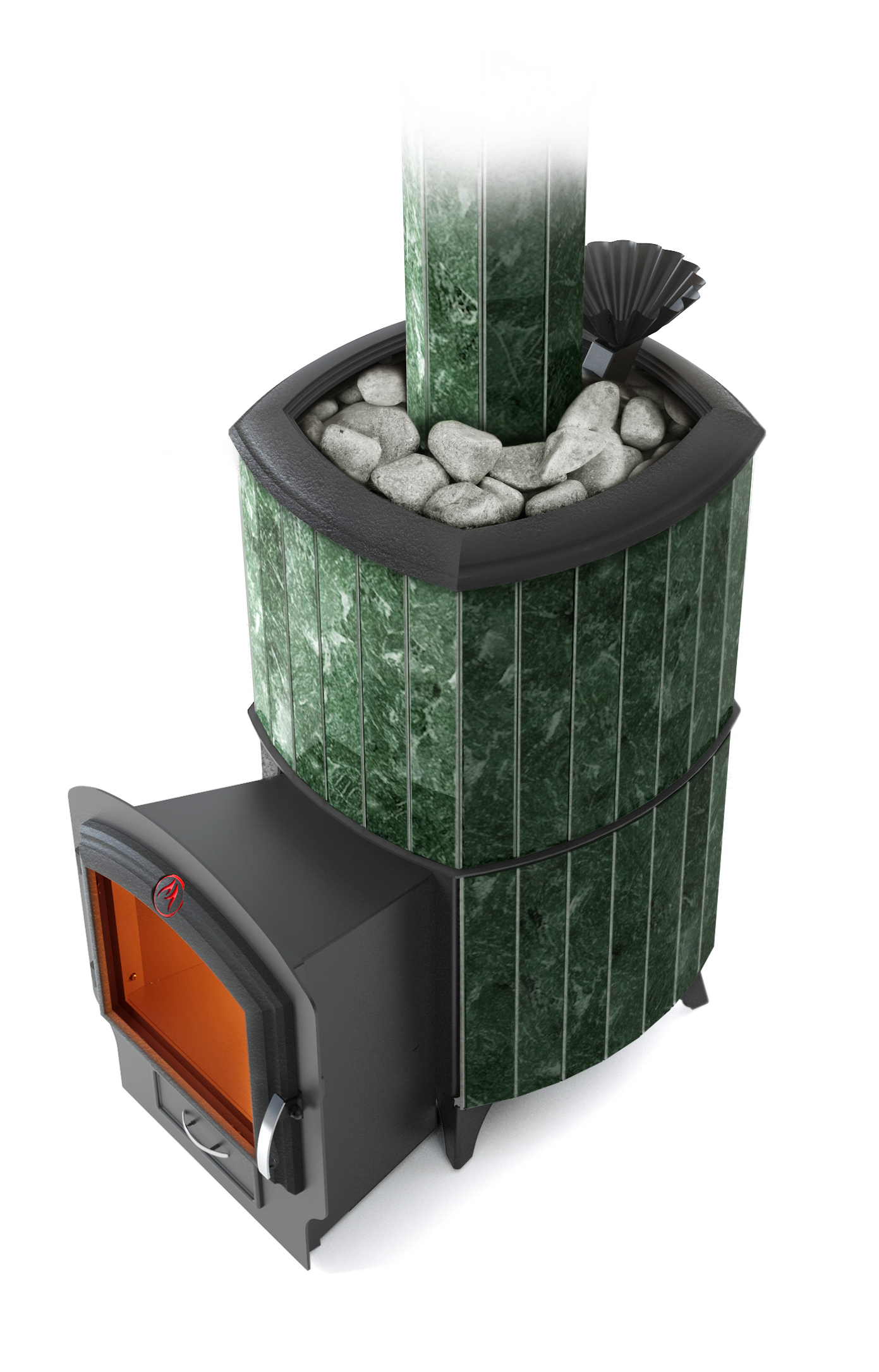 «Альфа Гардарика» – дровяная банная печь TMF в облицовке из природного камня. Стальная топка этой печи снаружи отделана вертикальными однородными ламелями из серпентинита.