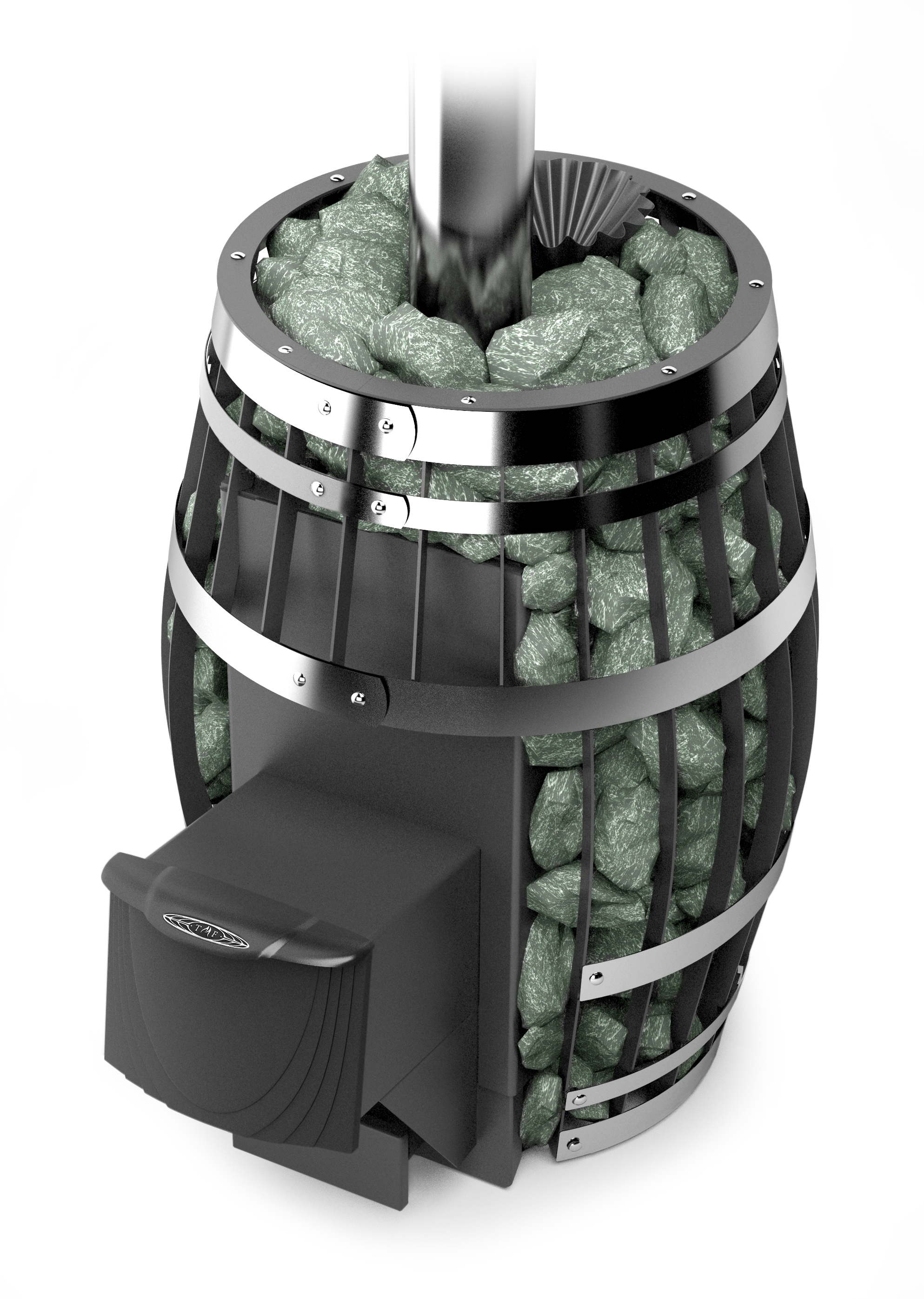 Закрытая каменка прогревается круговым потоком пламени со всех сторон.