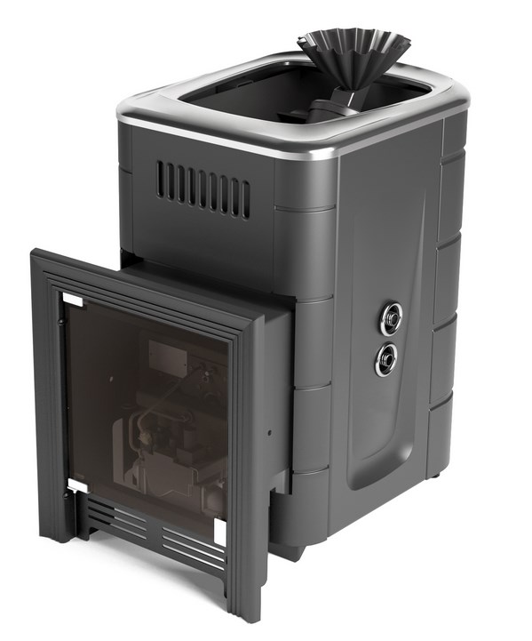 Печь-каменка банная Таймыр Мини 2017 Inox с большим светопрозрачным экраном, с закрытой каменкой, с теплообменником, антрацит