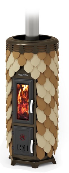 Она не лучит, «не пышет» жаром, а дарит комфортное мягкое равномерное тепло, свойственное кирпичным печам. Облицовка терракотовыми изразцами металлического кожуха печи способствует её более длительному остыванию. Такая керамическая «шуба» отлично аккумулирует тепло, постепенно отдавая его окружающей среде.