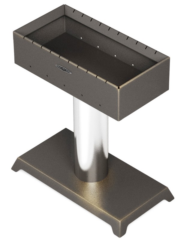 Мангал представляет собой элегантную сборную металлическую конструкцию, состоящую из короба, цилиндрической стойки и опоры.